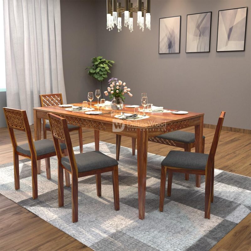 aharaja Sheesham Wood Dining Table 6 Seater | Wooden Six Seater Dinning Table with Grey Cushion Chairs & Bench | Dinner Table 6 Seater | Dining Room Sets | Self Assembly, Natural Finish
