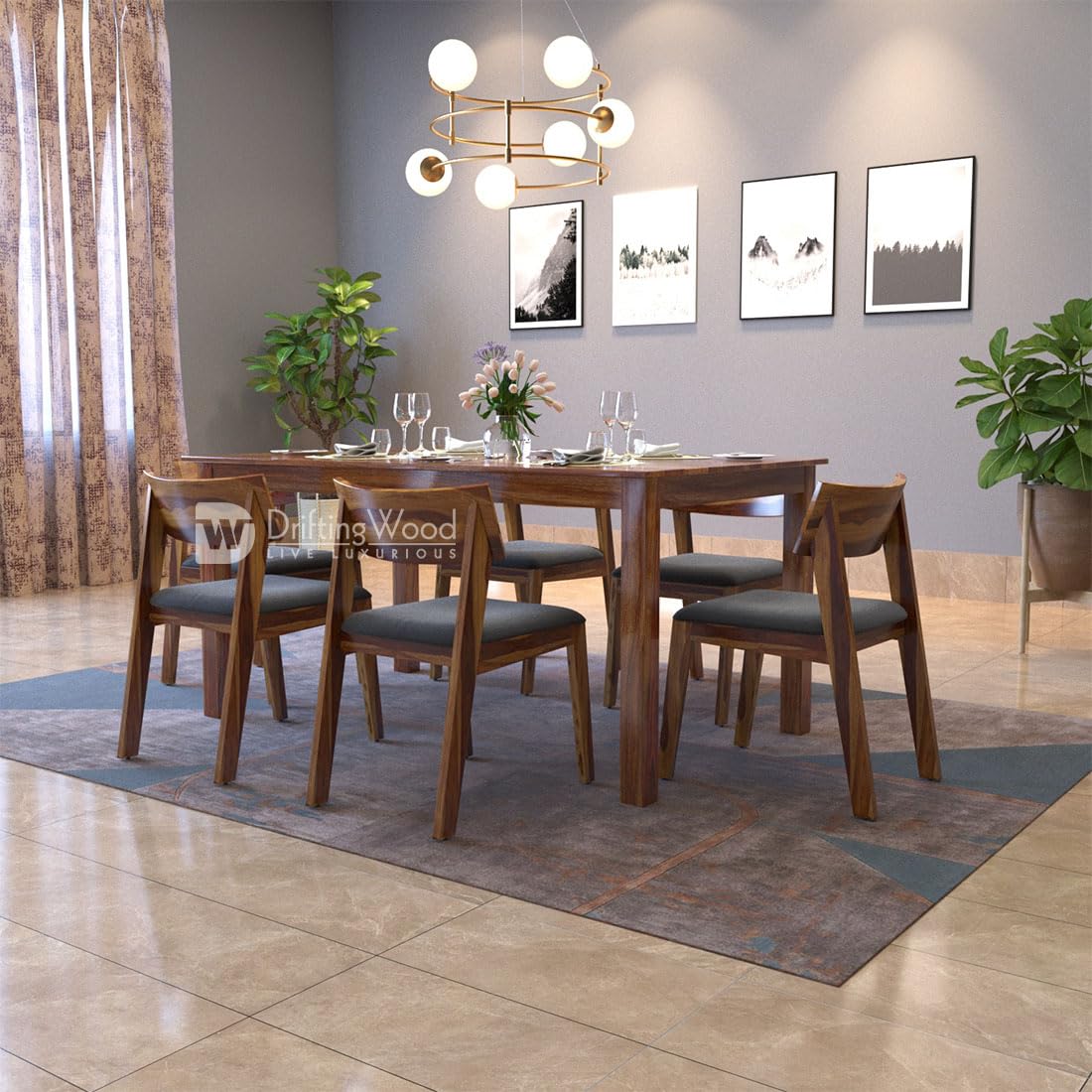 DRIFTINGWOOD Liana Solid Sheesham Wood Dining Table 6 Seater | Wooden Six Seater Dinning Table with Grey Cushion Chairs | Dinner Table 6 Seater | Dining Room Sets | Self Assembly, Natural Finish