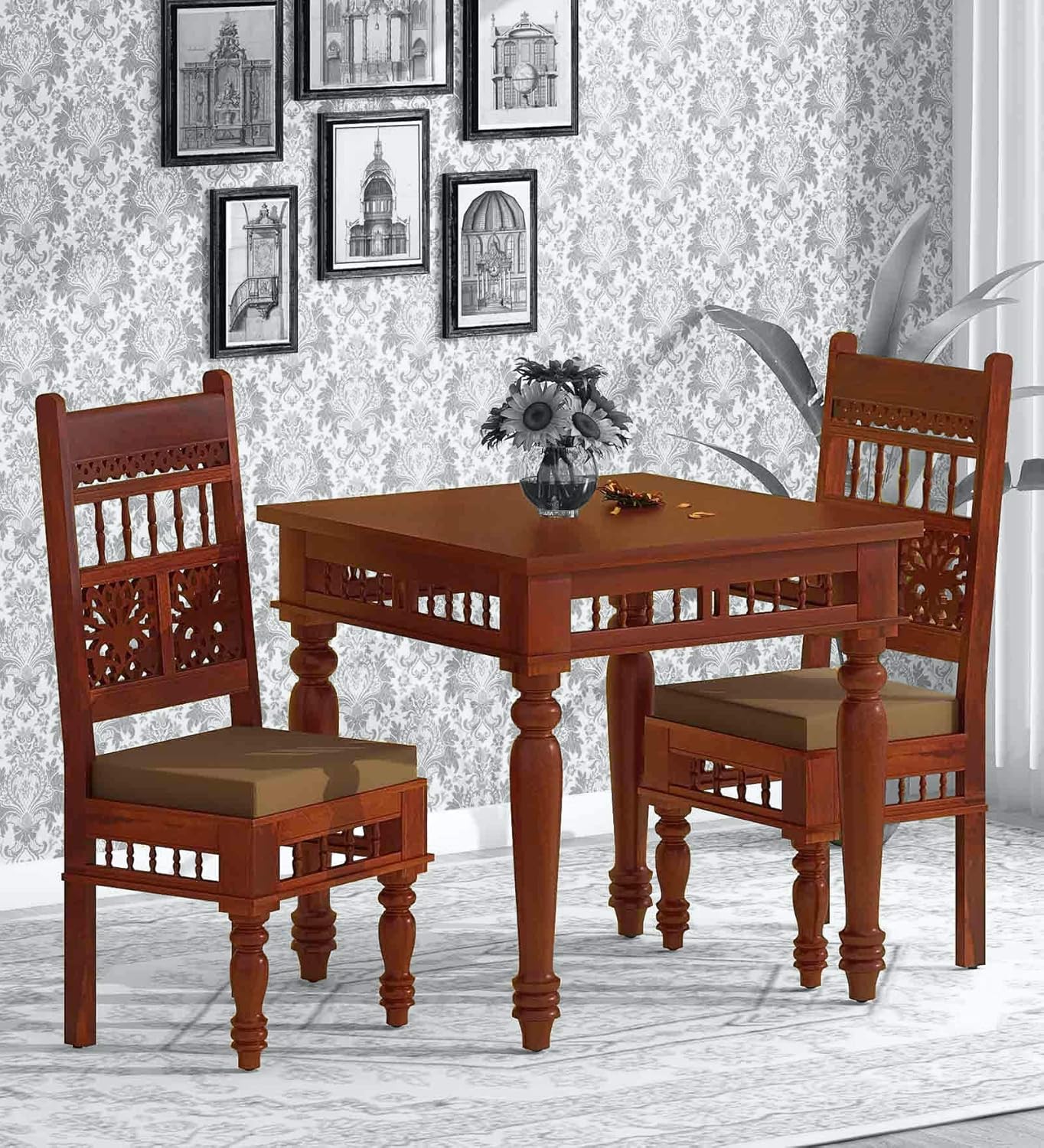Handicraft Solid Sheesham Wood Dining Table 2 Seater | Wooden Two Seater Dinning Table with 2 Chairs for Home | Chairs with Cushion | Dining Room Sets for Restaurants | Rosewood