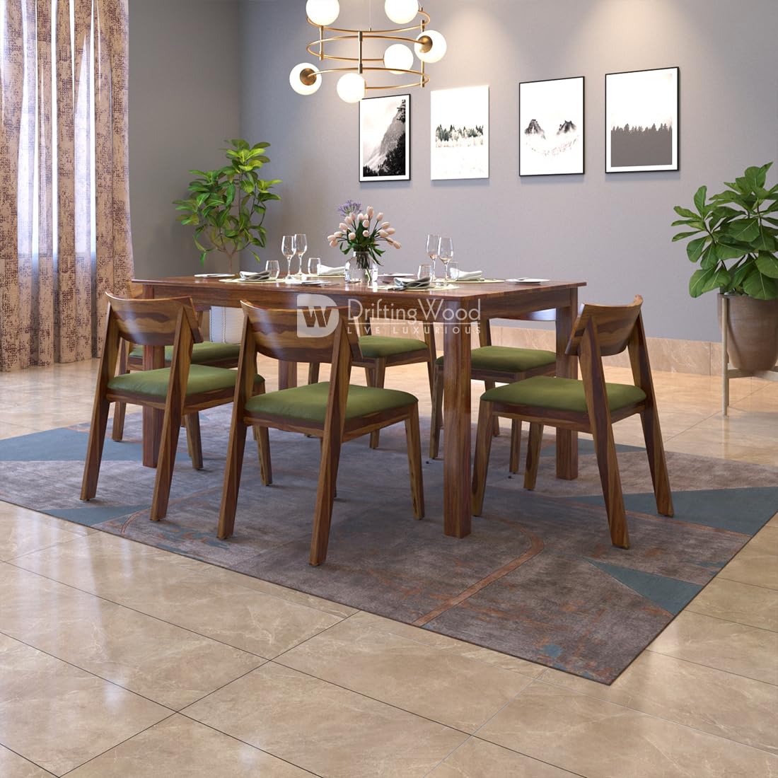 Liana Solid Sheesham Wood Dining Table 6 Seater | Wooden Six Seater Dinning Table with Green Cushion Chairs | Dinner Table 6 Seater | Dining Room Sets | Self Assembly Natural Finish