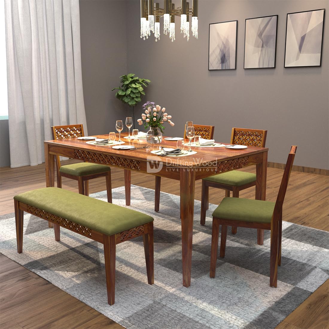 Maharaja Sheesham Wood Dining Table 6 Seater | Wooden Six Seater Dinning Table with Green Cushion Chairs & Bench | Dinner Table 6 Seater | Dining Room Sets | Self Assembly, Natural