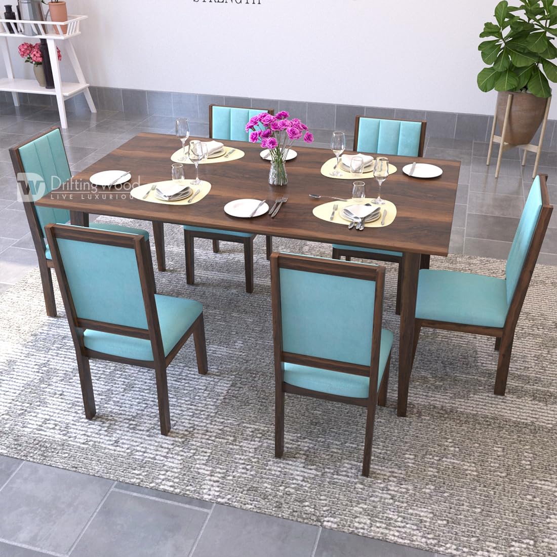 Solid Sheesham Wood Dining Table 6 Seater | Wooden Six Seater Dinning Table with Cushion Chairs | Dinner Table 6 Seater | Dining Room Sets | Self Assembly, Walnut Finish