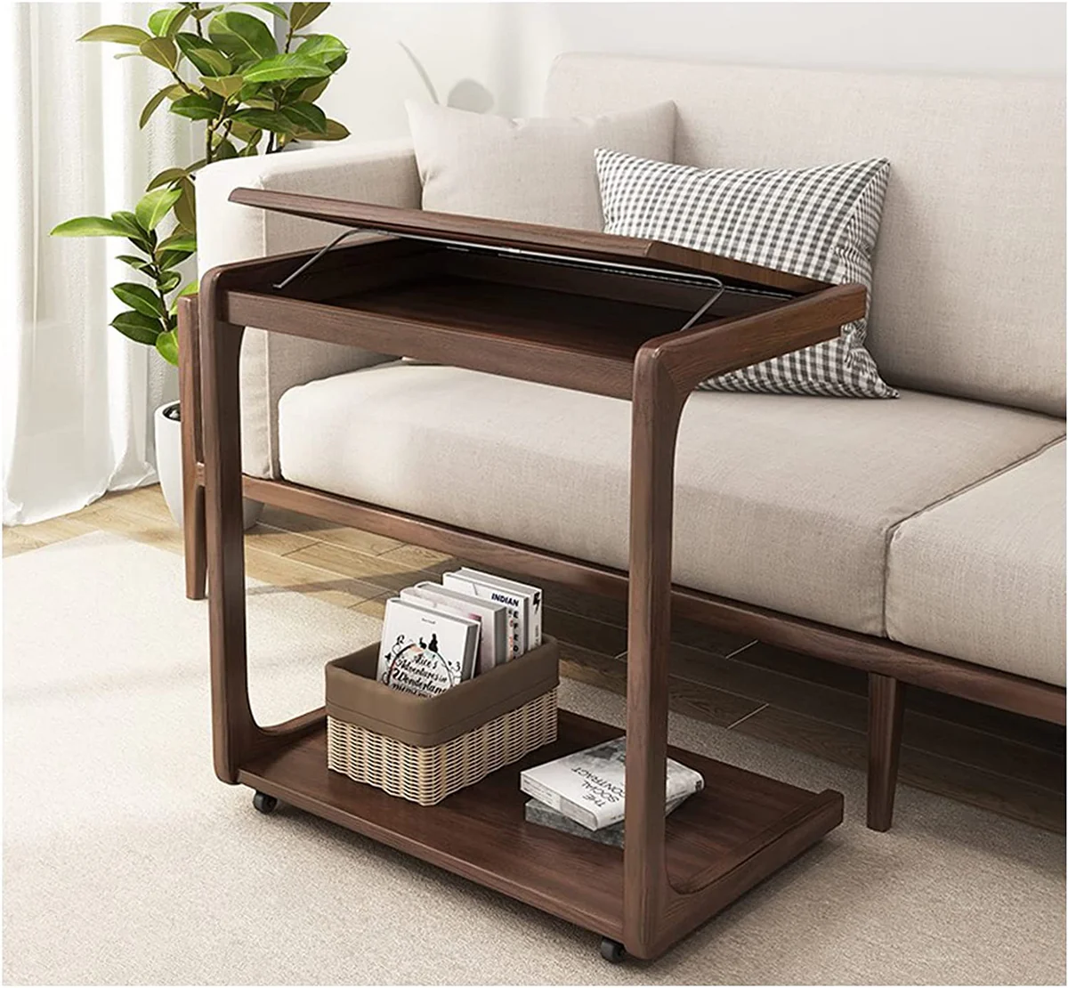 Solid Wood C-Shape Adjustable Flip End Table with Lockable Wheels